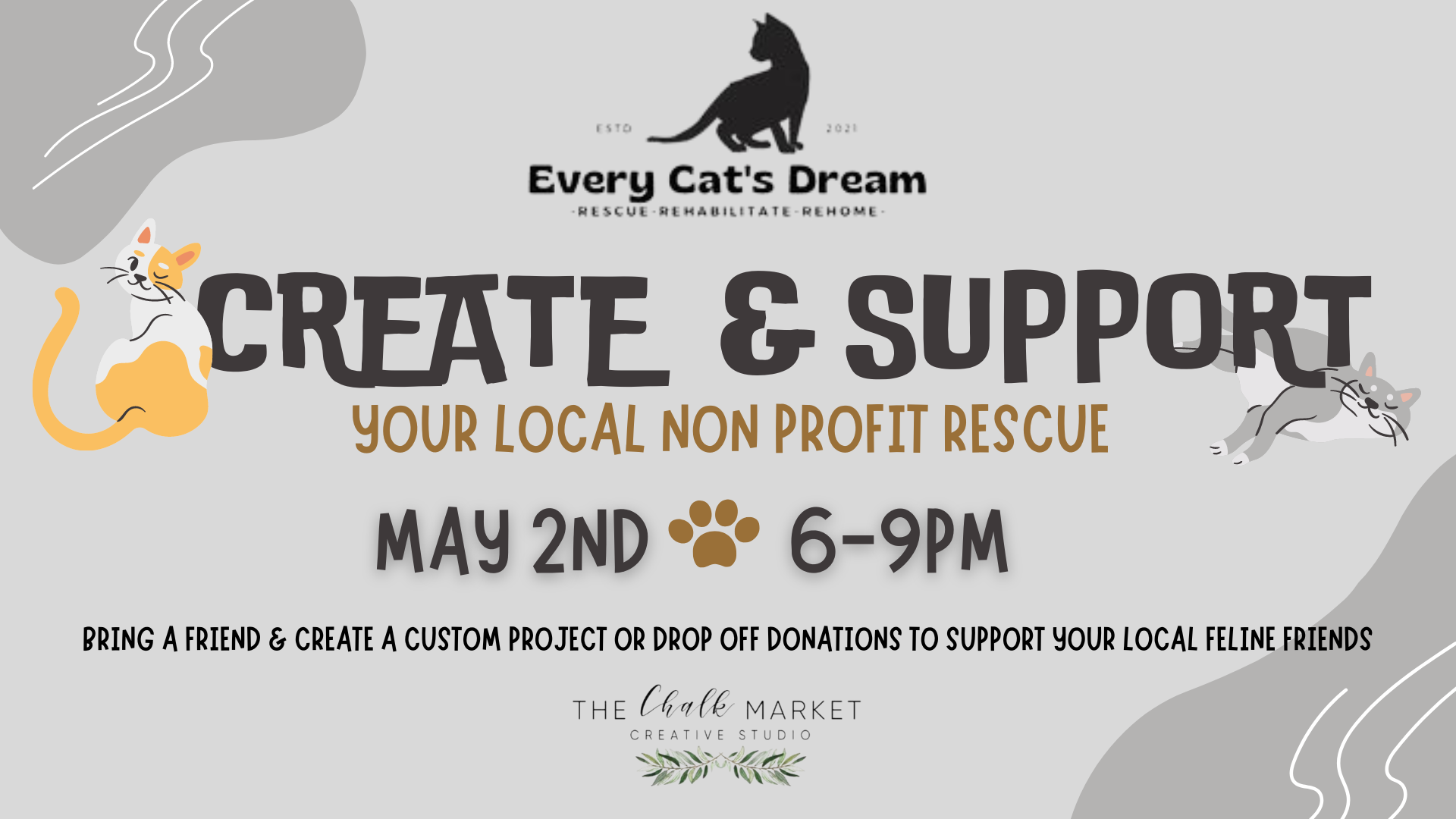 Thank you for joining the Every Cats Dream Fundraiser on May 2nd 6-9pm hosted by The Chalk Market! Please fill out the form below to choose your project for this event.